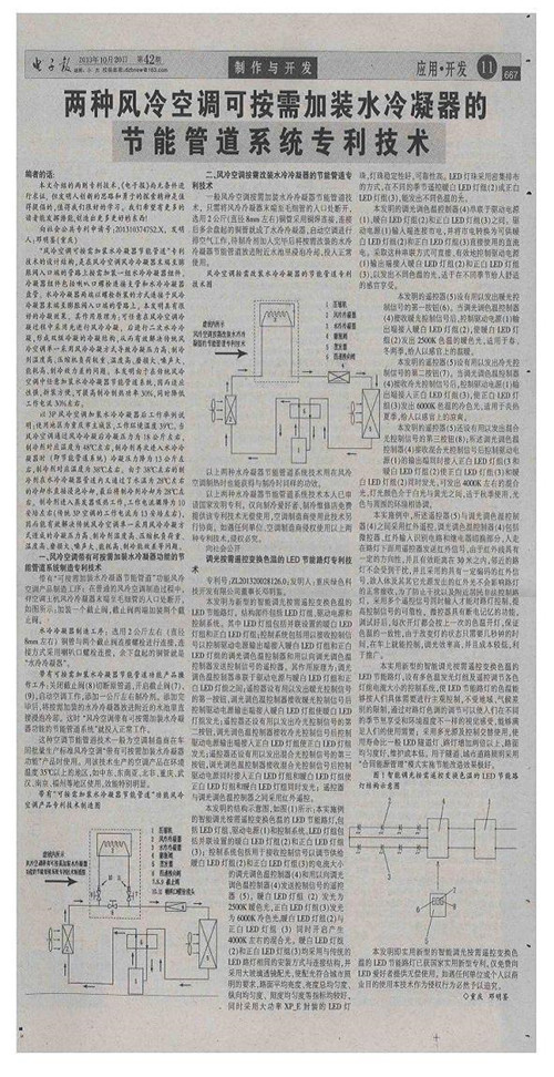 Division I to the public, two kinds of air-cooled air conditioning can be installed as required water condenser energy saving pipe system technology and intelligent dimming, on-demand remote control color temperature LED energy-saving street lamp patented technology. The following three patented technologies have been published in the 20 and forty-second issue of "electronic newspaper" in October 2013, providing the patent right for refrigeration enthusiasts, refrigeration repair shops and LED enthusiasts. In case any entity or individual uses any of the above patent technologies for commercial purposes as an infringement, it is bound to be investigated.